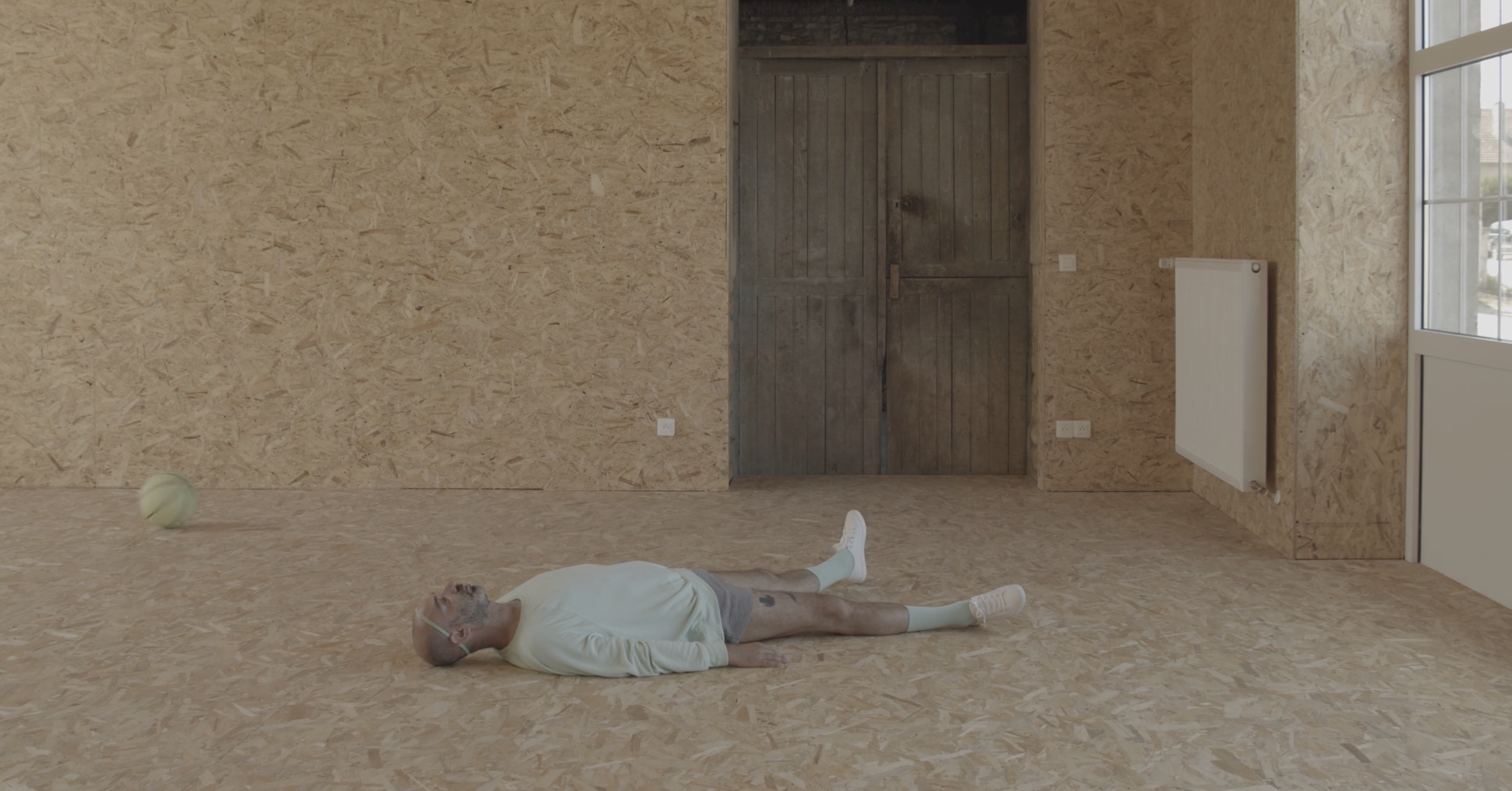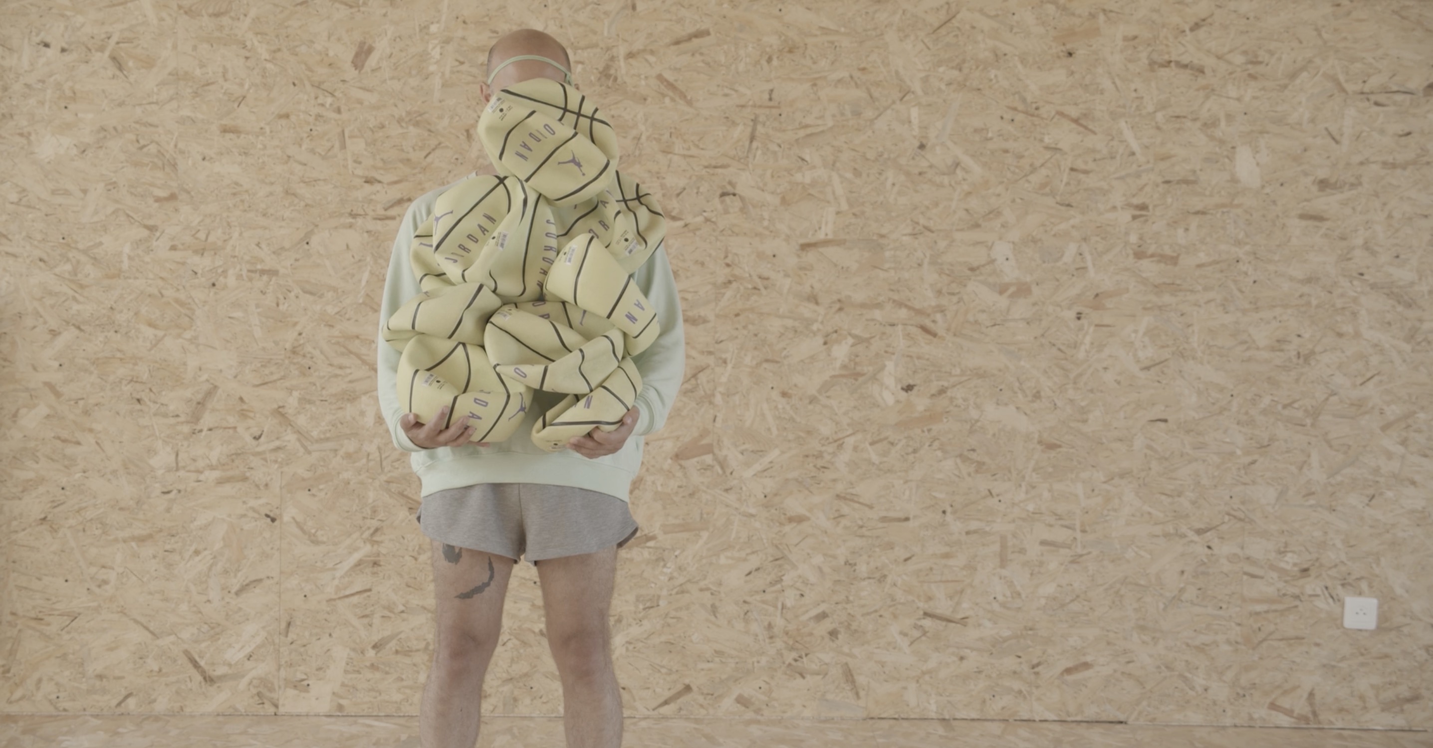 Alone. Feet facing the line. Imagine the ball rolling over your fingers. Visualise its trajectory as it moves through the air. Keep your hands in the air. The ball crosses the net. Swish!In his reinterpretation of the Breaking The Backboard performance, Frédéric Liver immerses himself in this world and its materials, embodying them in a personal and solitary way.